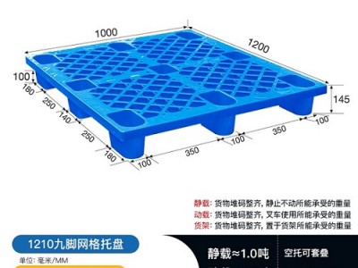1210九脚网轻托盘是一款长1.2米,宽1米的塑料托盘,其底部结构为九脚,面板呈网格状。托盘采用网格镂空加强筋设计,即能提高整体抗冲击和载重能力,又具有良好的防潮性,使货物始终处于通风状态不易损坏。底部九脚全采用加固加厚设计,载重性更强,不易崩塌,不易变形,稳固且耐用。托盘表面设有密集小颗粒防滑颗粒,增加产品与货物之间摩擦能力,保证货物在运输过程中不易滑落。由于此款托盘不能加钢管及芯片槽且载重能力比较轻,大多数用于轻型货物使用,如商超等行业。注意此款托盘万不可上货架。